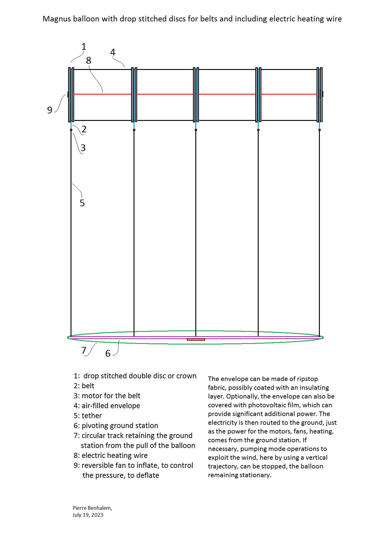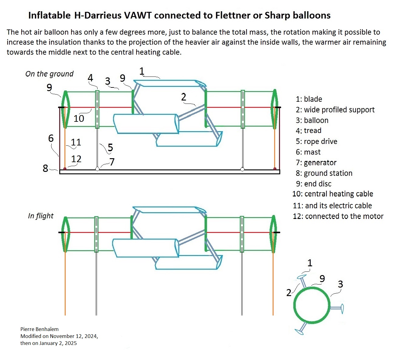 A kite can suspend the H-VAWT-Magnus or Sharp balloons as outlined below, just like for previously described devices. However, this does not seem advantageous and adds complexity in handling. The buoyancy of the balloons (and perhaps also of the blades) is achieved by inflating with hydrogen or helium, or by hot air using a central heating cable (see above) or by using thermal solar energy. Solar photovoltaic film can be added around the balloons and blades.
