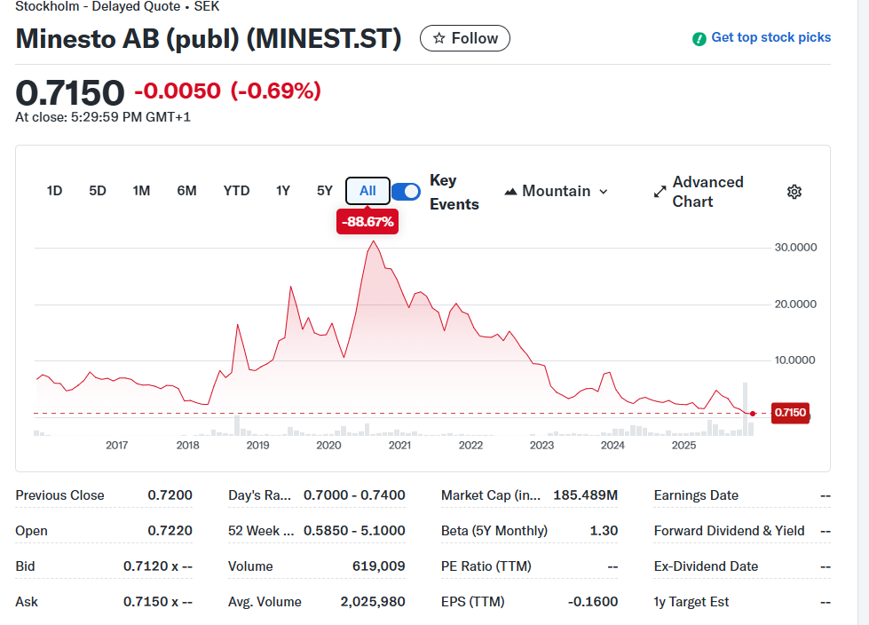 I just checked their stock price, and if you had invested at the peak price of 30 Swedich Kroner per share, you would have lost something like 98% of your money, because their stock price is now down to 0.715 SEK, which is about 7.7 cents.