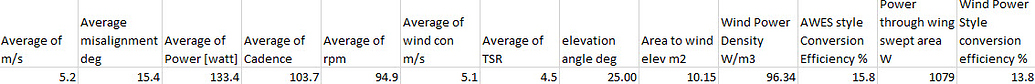 15.8% (AWES style), and 13.8% (wind power style), i.e. power coefficients (Cp) respectively of 0.158 and 0.138. I remember having seen other measures, but I don’t remember where, maybe in @Ollie 's publications.