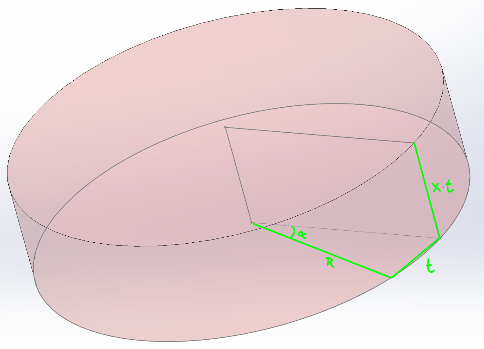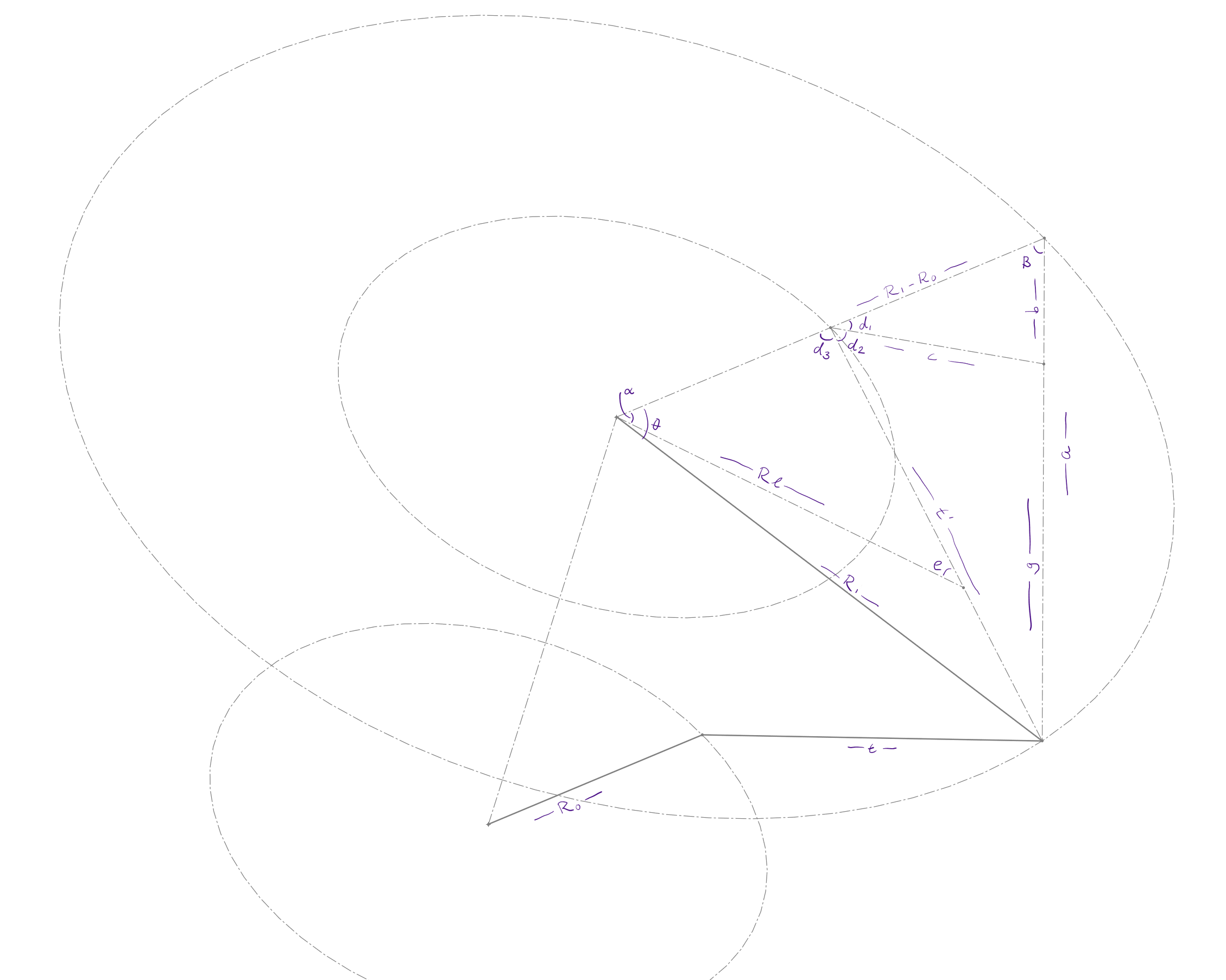 I’ve just calculated the length of one of the blue dashed lines, the other one is the same length. This blue triangle is a right triangle. The hypotenuse is l. The base then is \sqrt{l^2 - (r_1^2 + r_2^2-2r_1r_2\ cos\ \theta)}. The angle of the acute angle is arcsin(\dfrac{\sqrt{r_1^2 + r_2^2-2r_1r_2\ cos\ \theta}}{l})