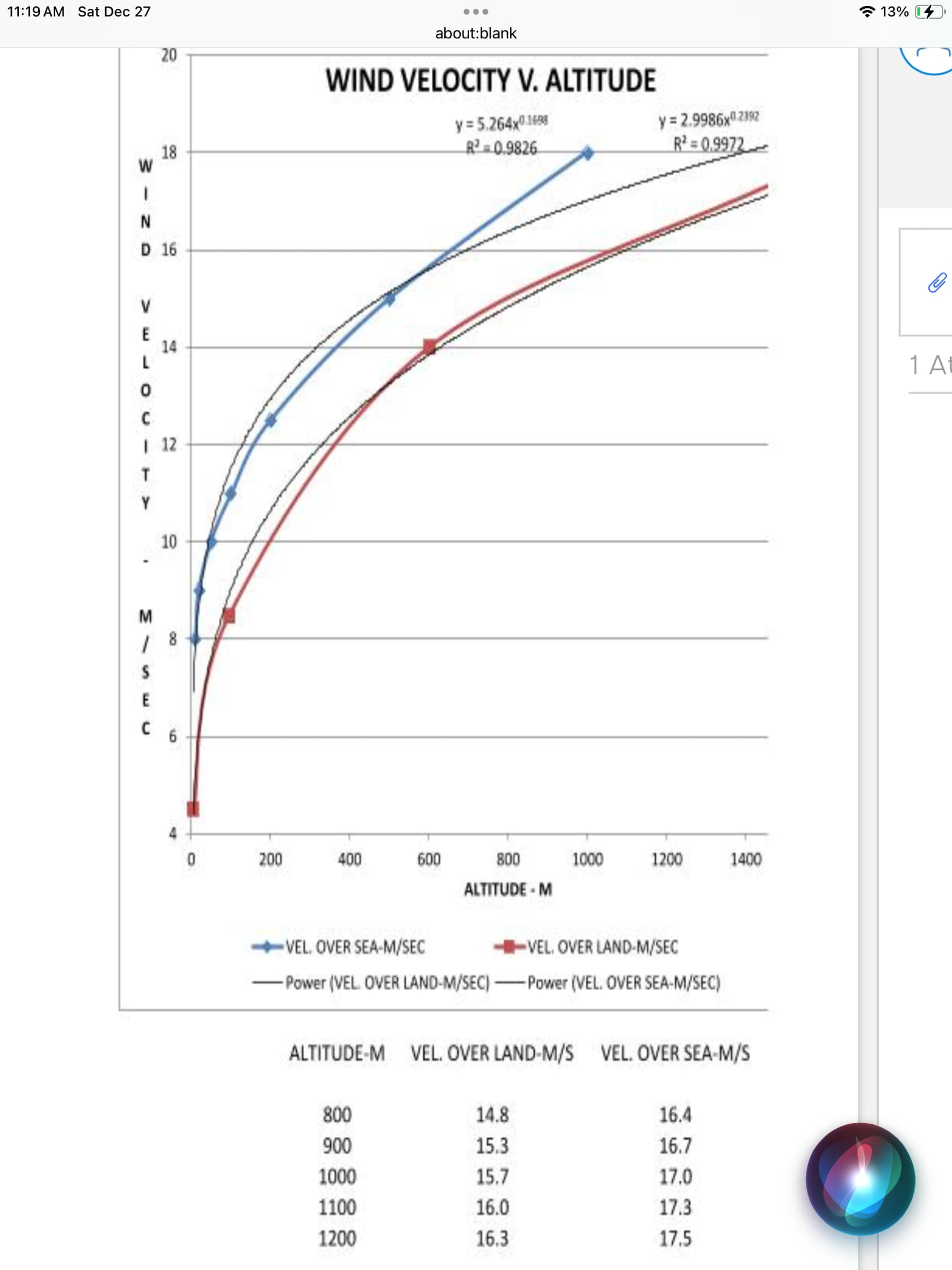 I think we should concentrate on developing the Kitewinder system, since this is one of the only systems where the cosine losses are zero at high altitude. Most of the other systems will not permit operation at tether angles of greater than 45° without causing unacceptable loss in efficiency. I also don’t understand why power is limited with wind velocities above 13 to 14 m/s. Can’t we design groundgen generators that can withstand these loads? As shown in the data below the average wind speed at 1000 M altitude varies from 15.7 to 17.0 m/s depending on whether measurements are taken over land or over the sea .