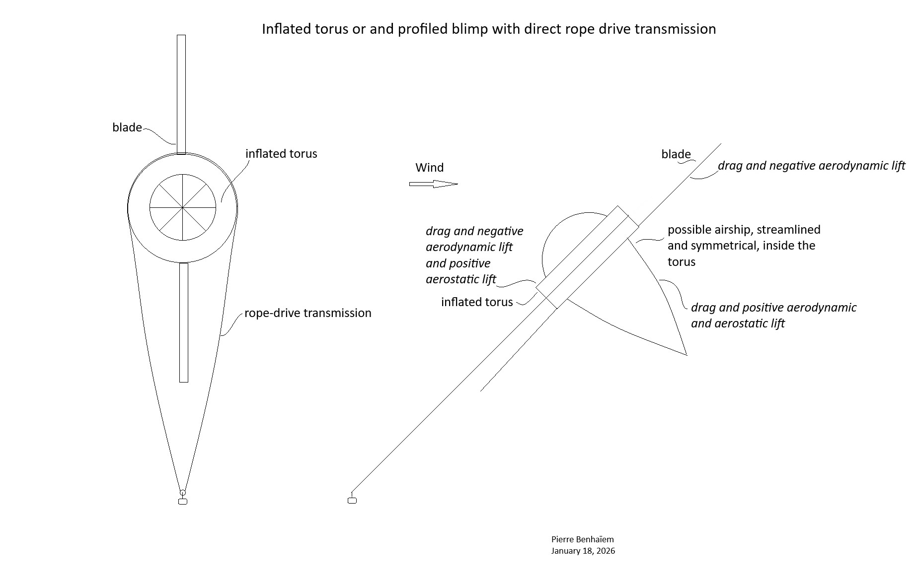 The problem is that, for both designs, direct cable transmission requires the rotor to tilt in an inverted position under the effect of the wind, resulting in negative lift in addition to drag.