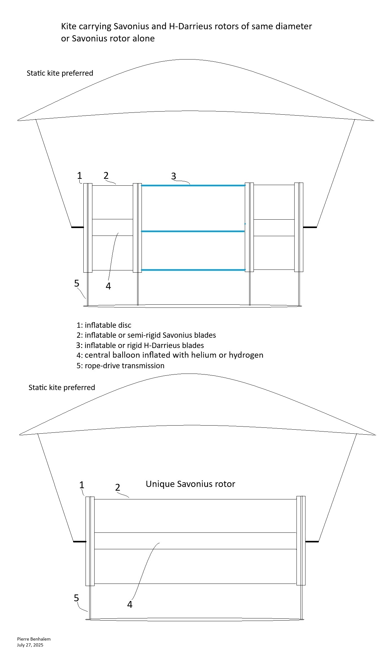 As the VAWT shown here sweeps a large area, the Savonius rotors may need to be longer in order to counter the drag generated by the VAWT. The sole purpose of rope drives is to transmit torque from the combined VAWT and Savonius rotors. The TSR of a Savonius kite can be estimated at 1, and that of a VAWT at 3, perhaps more. Their respective diameters are adjusted, just like the Sharp balloons with their VAWT. The discs are of a much smaller diameter than that of the VAWT which then includes amounts supporting the blades. A lattice of inflatable bars can increase the rigidity of the VAWT. Usually a Savonius turbine is installed inside a Darrieus turbine to help starting. But such a disposition would destroy the lift of a Savonius turbine settled horizontally as shown with tests using a Sharp rotor inside the Darrieus VAWT. It is the reason why Savonius rotors are settled externally to the main Darrieus VAWT.